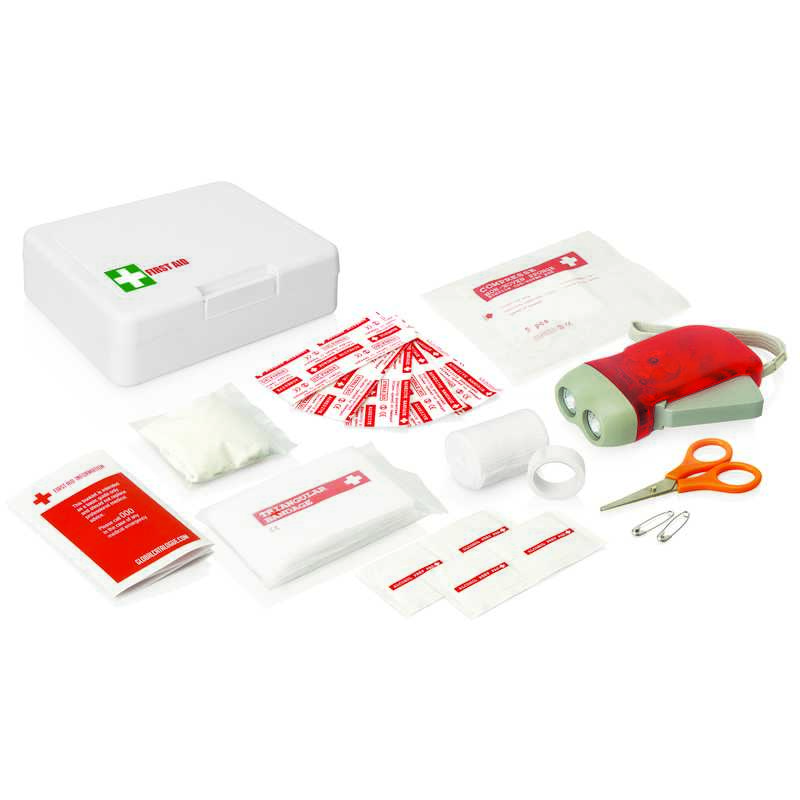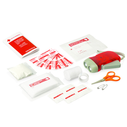 Item Features: 5x large plasters|4x alcohol wipes|1x PBT bandage|1x triangular bandage|5x non-woven pads|1x pair latex gloves|2x safety pins|1x scissors|1x paper tape|1x dynamo torch with internal battery|1x First Aid information booklet