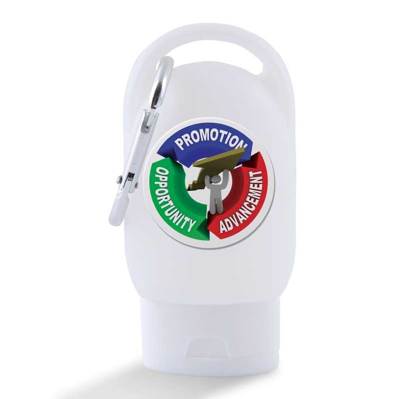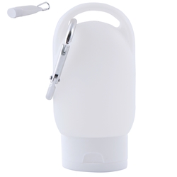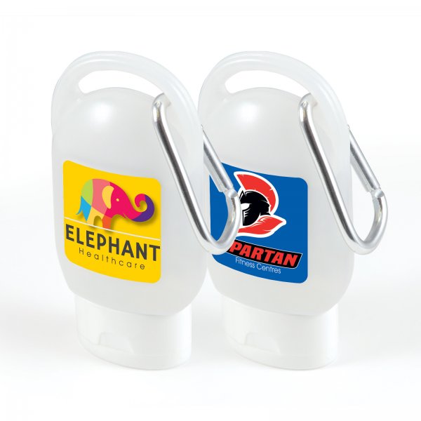 30ml alcohol based clear gel with moisturiser and Vitamin E in white plastic squeeze bottle. Kills most germs and leaves hands feeling refreshed and clean. 62% alcohol content. Directions, safety information, statutory information and importers name pre-printed on back. Colours: Silver, White. Dimensions: 48 x 95 x 24mm (LxHxD) (excluding carabiner).