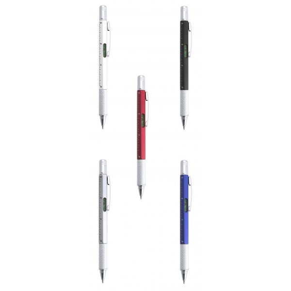 Multi-tool ball pen 4-in-1 with twist mechanism, in varied colors and with soft grip. With built-in level in body, ruler with metric system in centimeters/inches and double-head screwdriver -flat and star-shaped. With metallic clip and blue ink. Colours: Black, Blue, Red, Silver, White. Dimensions: 14.9 x 1 cm.