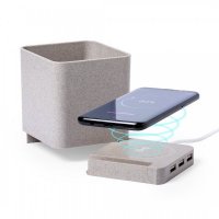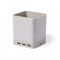 4 in 1 nature line multifunction pen holder. Manufactured in wheat straw, to encourage the use of natural raw materials and reducing contaminant emissions. With pen holder, smartphone holder, wireless charger and USB port (3xUSB 2.0) functions. Compatible with smartphones equipped with wireless charging technology. Including 1 meter long , white color micro USB cable. Presented in an attractive eco-design box. Instruction manual available in Spanish and English. Colours: Natural. Dimensions: 8.5 x 10 x 9 cm