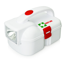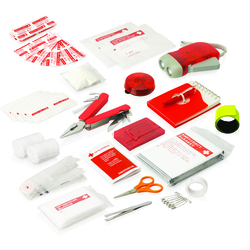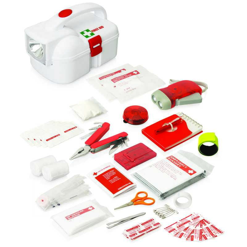 Item Features: 10x large plasters|8x alcohol wipes|2x PBT bandages|1x triangular bandage|10x non-woven pads|1x CPR mask|1x pair latex gloves|6x safety pins|1x scissors|1x tweezers|1x paper tape|1x emergency blanket|1x reflective wrist band|1x emergency reflector light|1x 12 function multi tool card|1x 9 function multi-tool|1x backup dynamo torch with internal battery|1x First Aid notepad|1x First Aid information booklet|Batteries included
