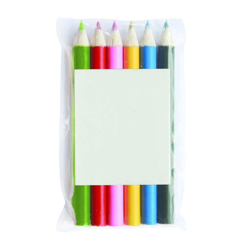 6 Coloured Pencils in Pouch. Various coloured pencils are presented in a pouch with an insert that can be pad printed with your promotional logo to create a branded gift for the kids.