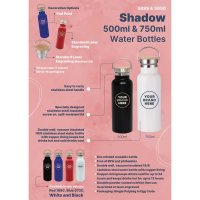 750ml capacity bottles, are made of double-walled stainless steel and are vacuum insulated for maximum temperature control. With a convenient twist off cap and carrying handled and are able to hold ice for up to 24 hours, or keep hot drinks HOT. All bottles are crafted from food grade stainless steel and are BPA Free. These are packed in a single polybag with egg crate package. Hand wash only. Do not freeze or microwave. Colours: Black, Blue, Red, White. Dimensions: 270mm H x 76mm W.