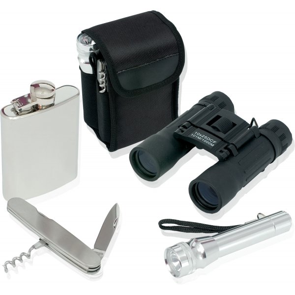 For the outdoor adventurer, waist belt carry case with binoculars, hip flask, torch and pen knife. Colours: Black/Silver. Dimensions: 130 x 95 x 60mm.