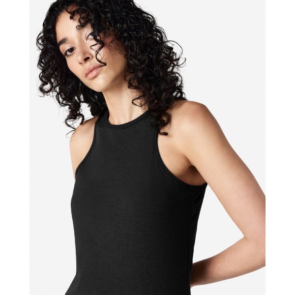 - Rib binding at neckline and armholes