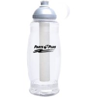 A 946ml plastic BPA free water bottle with an attached screw on lid featuring an easy pull leak resistant spout. Includes a free freezer bar. Material: AS & PP Plastic. Colours: Translucent Red, Blue, Orange, Lime, Smoke, Clear. Dimensions: 946ml.
