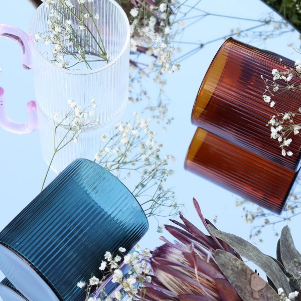 Archer Ribbed Glass Cup (320ml) is a beautiful, ribbed glass that takes inspiration from the artistic and architecture of the art deco movement, from the arch of the handle to the pops of colour and vintage style ribbed glass. Made from borosilicate glass, it can hold both hot and cold drinks. Colours: Clear, Blue, Brown. Dimensions: 155mm W x 125mm H.
