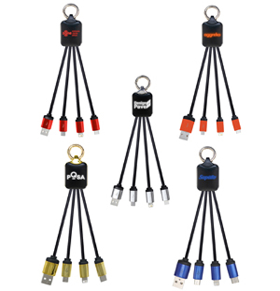 Features: The Atesso 3n1 charge cable with its double sided light up branding will bring your logo to life. What makes this product unique is its anti-tangle cable, water plated head, contrasting connectors and key-ring attachment, all packaged in a press lock pouch which can be fully customised. Note: Logo will only illuminate if engraved, not printed. Manufactured using high quality 24 AWG copper, this cable is suitable for all mobile devices and provides USB to Micro USB, 8 Pin (lightening) and Type-C connections. Material: ABS, Nylon Fabric, TPE