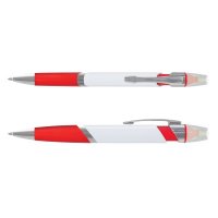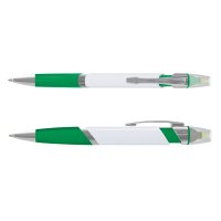 Retractable plastic ballpoint pen with a white barrel, a yellow highlighter, a frosted translucent soft-touch grip and shiny chrome trim. It can be branded in stunning full colour on both sides of the barrel. Avenger has a black refill with 600 metres of German manufactured Dokumental ink. Colours: Black, Blue, Green, Red, Yellow. Dimensions: Dia 14mm x L 151mm x 19mm (includes clip).