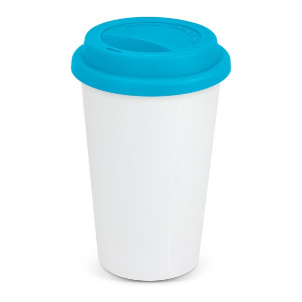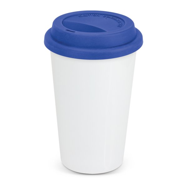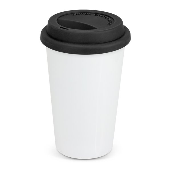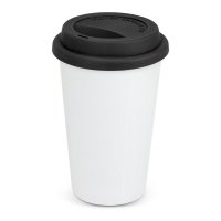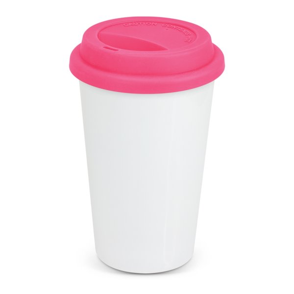 350ml double wall ceramic coffee cup which is manufactured for full colour wrap around branding. The double wall keeps drinks hot for longer and remains comfortable to hold. This product is not dishwasher safe and handwashing is recommended. Colours: Cup: White. Lid: Grey, White, Yellow, Orange, Pink, Red, Bright Green, Dark Green, Light Blue, Dark Blue, Purple, Black. Dimensions: Dia 90mm x H 150mm.