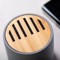 Bluetooth speaker in combination of natural cut bamboo pieces and limestone cement, a conglomerate formed by the combination of natural materials, mainly ground limestone and water, obtaining a material of great consistency and durability. Compact size, with Bluetooth® 5.0 connection and 3W of power. Compatible with iOS and Android, includes micro USB charging cable and comes presented in an attractive design box. Spanish and English instruction manual available. Bluetooth Connection. Power 3W. USB Rechargeable. Cable Included. Colours: Natural. Dimensions: 6.8 x 7.2cm - 280 grams.