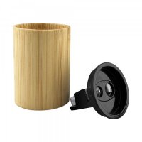 Bamboo pencil sharpener with specially designed black plastic lift off lid that enables clean disposal of pencil shavings. Suitable for skinny and large standard pencils. Natural bamboo material which produces unavoidable variances in the grain pattern, colour and branding. Colours: Black/Natural. Dimensions: 64mmH x 43mmD.