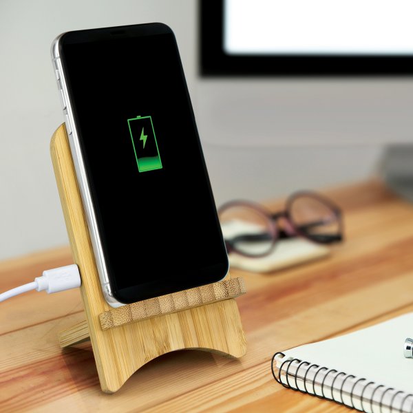 Environmentally conscious 5W wireless charging stand which is manufactured from bamboo. It is compatible with devices that are enabled for wireless charging and will charge most modern phones. Simply plug it into any USB port or a mains adapter and place a compatible device on it for convenient wireless charging. It is supplied in two parts which are easily assembled along with an 80cm Micro-B USB cable and an instruction leaflet. Bamboo is a natural material which produces unavoidable variances in the grain pattern, colour and branding. Please note that some phone cases may affect the wireless charging connection. Colours: Natural. Dimensions: W 70mm x H 117mm x D 60mm.