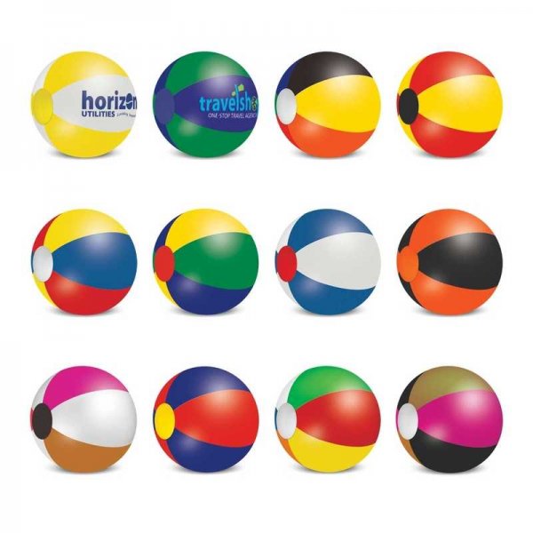 Beach balls in the choice of six different sizes 21cm, 28cm, 34cm, 40cm, 48cm, 60cm supplied flat packed ready for inflation. The six side panels and two round end panels can be mixed and matched using the seven standard colours in an incredible 5040 different colour combinations and other material colours may be available on request. The colour chosen for the round end panels must be the same for both ends and a production lead time of 20 working days applies to this product.