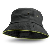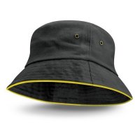 Premium cotton twill black bucket hat with coloured trim and a sweatband. The hat's material provides excellent UPF50 protection from the sun and is available in three sizes which will fit most people, including kids. Care label. Colours: Hat: Black. Trim: Grey, Yellow, Orange, Red, Bright Green, Light Blue. Sizes: Small (54cm), Medium (57cm), Large (60cm).