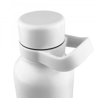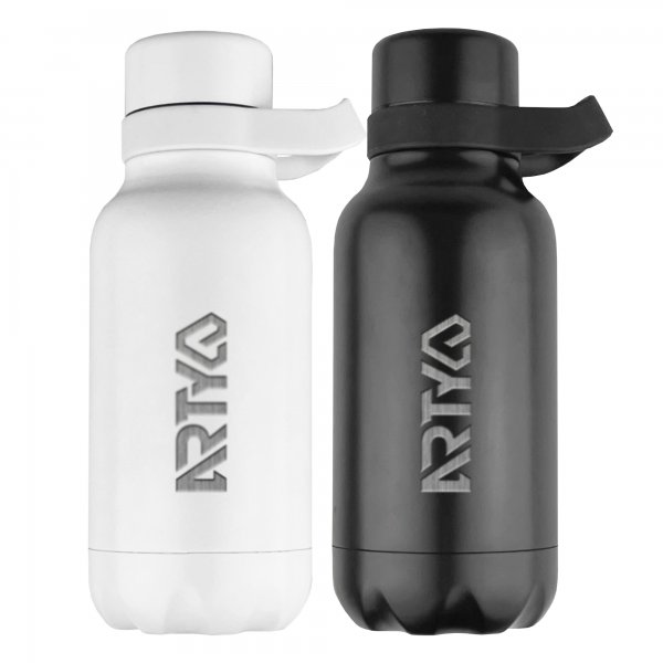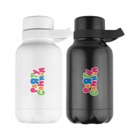 Stylish vacuum insulated 304 stainless steel bottle with a secure screw on 304 stainless steel lid and a soft-touch silicone strap that doubles as a carry handle. Available in 2 sizes: 500ml or 380ml. BPA free. Hand wash only, do not microwave. Colours: Black, White. Dimensions: 205mmH x 70mmW.