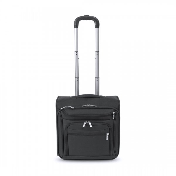 2 wheeled multi-pocket business trolley in resistant 1200D polyester. In elegant black color, with matching color reinforced external handle, zippers with padlock holes -included- and practical front pockets. With name tag, numeric combination security lock and matching color zippers. Inside padded compartment for laptops up to 17 inches, with a wide range of pockets and inside pen sleeves. Colours: Black. Dimensions: 42.5 x 40 x 24 cm.