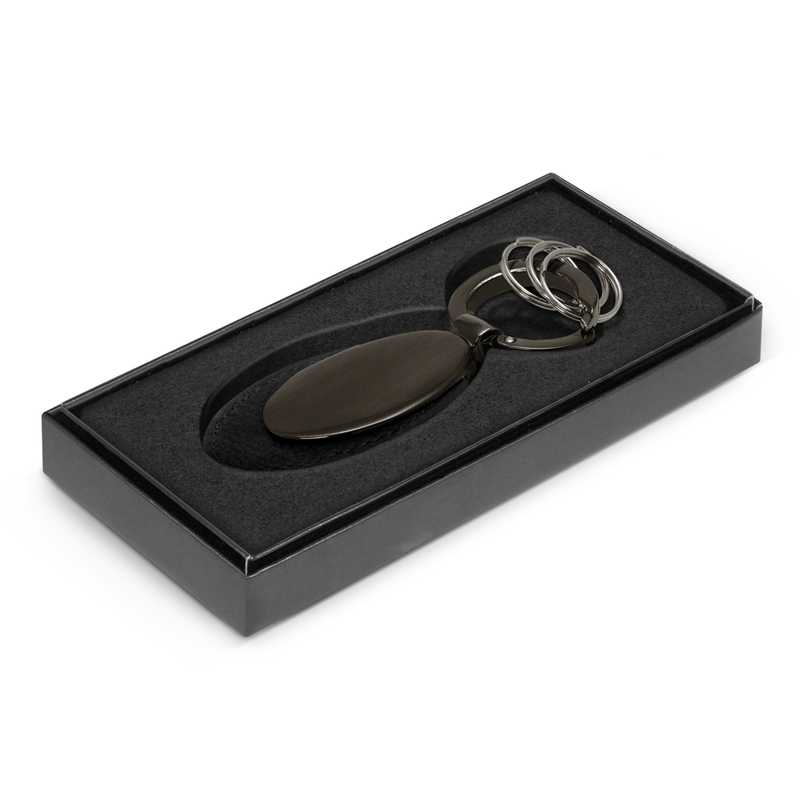 Premium leather and metal key ring with one large ring which has a spring loaded release clip. It features three smaller rings for grouping keys together which can be removed individually. Caprice has a gunmetal plated finish on both sides which can be laser engraved to a natural etch and it is beautifully presented in a black gift box.