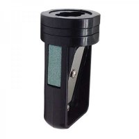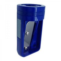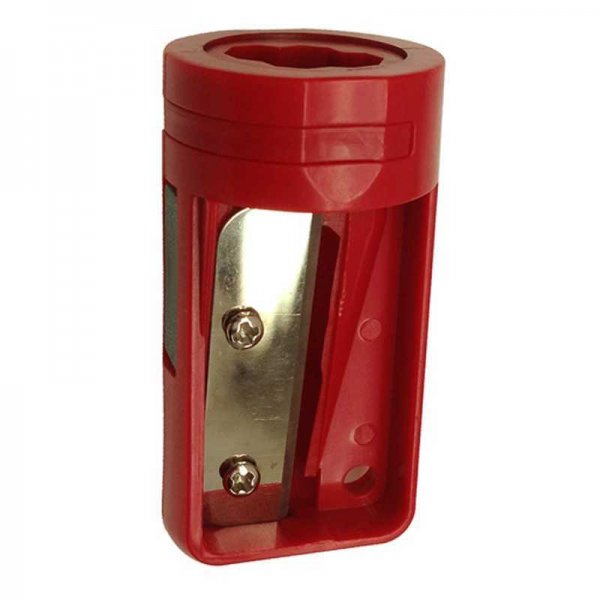 Plastic carpenter pencil sharpener with a metal blade and a small sand pad on the side. Colours: Black, Blue, Red. Dimensions: 54 mm x 27 mm x 27 mm.
