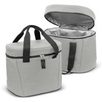 Large 20L cooler bag which is manufactured from robust 600D polyester with PE foam insulation encased in a water-resistant PEVA inner liner. It has a zippered top closure with large zipper pulls, woven carry handles and a front slip pocket. Colours: Natural, Charcoal, Grey, Navy, Black. Dimensions: W 330mm x H 270mm x 240mm gusset.