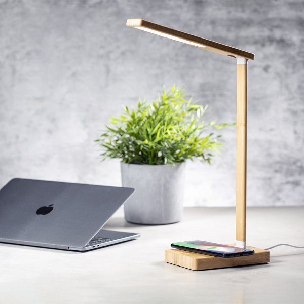 Nature line, folding lamp and charger. Made of bamboo from natural cuttings and with non-slip base. With integrated 10W wireless charger, including 25 LEDs with 3 lighting positions (warm, cold and medium) and adjustable intensity. 1H and 2H light timer, with USB output. Compatible with wireless charging mobile devices, including type C charger cable and presented in an attractive eco-designed box. Colours: Natural. Dimensions: 25 x 38.5 x 11cm, 430 grams.