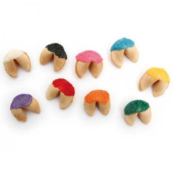 Vanilla fortune cookies personalized with custom messages, dipped in chocolate and decorated with corporate colour sugar.