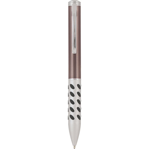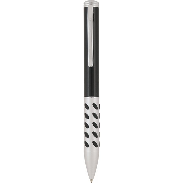 Twist action metal ball point pen with two tone barrel and smart rubber grip. Silver clip and Parker style black refill. Colours: black, gun metal.