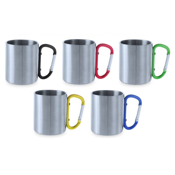 210ml capacity stainless steel mug with shiny finish body and original carabiner handle. Presented in an individual box. Colours: Black, Blue, Green, Red, Yellow. Dimensions: 8 x 7 cm.
