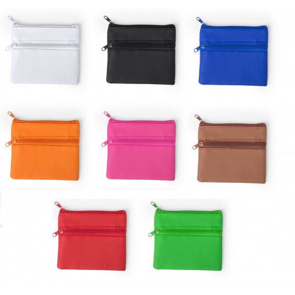 Coin purse of cheerful design with soft body finished in bright PU leather in a wide range of bright colours. Main compartment and front pockets with matching zipper closure. Matching lined inside. Colours: Black, Blue, Brown, Fuchsia, Green, Orange, Red, White. Dimensions: 10.5 x 9 x 0.8 cm.