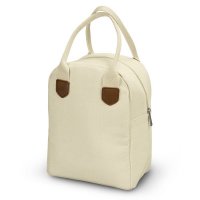 Stylish lunch bag made from robust 450gsm cotton canvas with PE foam insulation and a water-resistant PEVA lining. The cotton carry handles have leather-look PU accents, and the bag has a zippered main compartment with a slip pocket at the front. Colours: Natural. Dimensions: H 260mm x W 200mm x Gusset 120mm (excludes handles). Handle Length: 377mm.