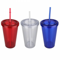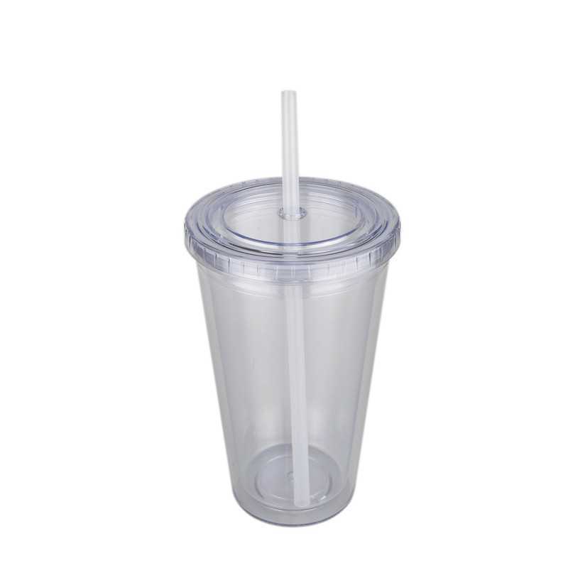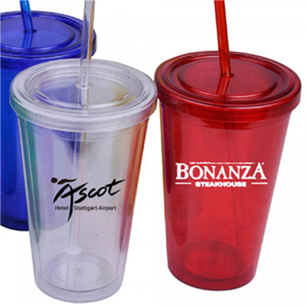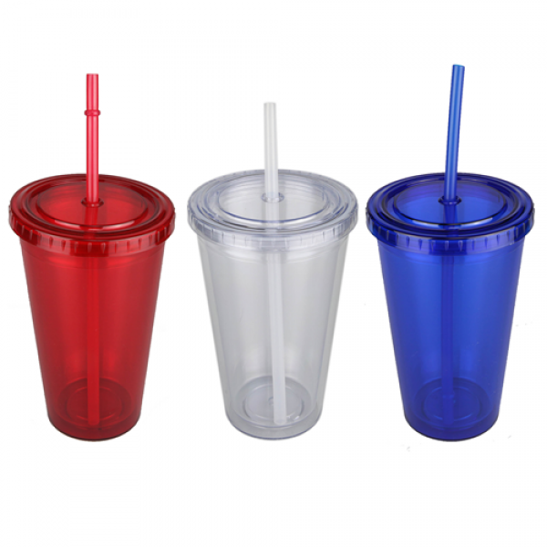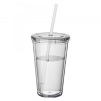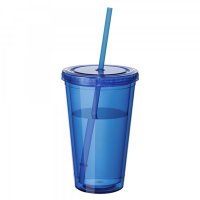 473ml high quality double wall AS plastic tumbler, strong and durable, leak tight screw on lid with a long plastic straw which has a stopper to avoid falling out, BPA free. It is not dishwashing safe and handwashing is recommended. Colours: Blue, Clear, Red. Dimensions: 158mmH x 100mmD.