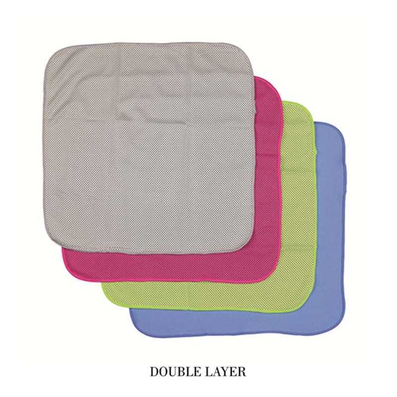 Magic Cooling Face Cloth 1. Material: 50% polyester + 50% cotton fiber + imported cooling fiber 2. Gently wringing the wet towel out and shaking several times, only few seconds become cool (15 degree bellow outdoor temperature) 3. Double layer fabric(better feeling in hand), light weight, refreshing 4. 98% UV blocking rate, 30+ UV protection index 5. Chemical-free, physical cooling effect 6. Normal temperature water even 90 degree hot water, and sweat can generate cooling effect just in few seconds 7. Machine washable 8. Works great for sports, outdoor activities and hot environment works 9. Do not bleach the towel, it may damage the fabric 10. Do not leave the towel in high temperature/high humidity for a long time 11. The edge of the towel my become loose and curl after long washing or use 12. Do not fold when it is hard, simply wet it to soften 13. Do not put it in dryer 14. Package: plastic bag + instruction sheet. Colours: dark blue, sky blue, lime green, pink, orange, grey. Dimensions: 300 mm x 300 mm
