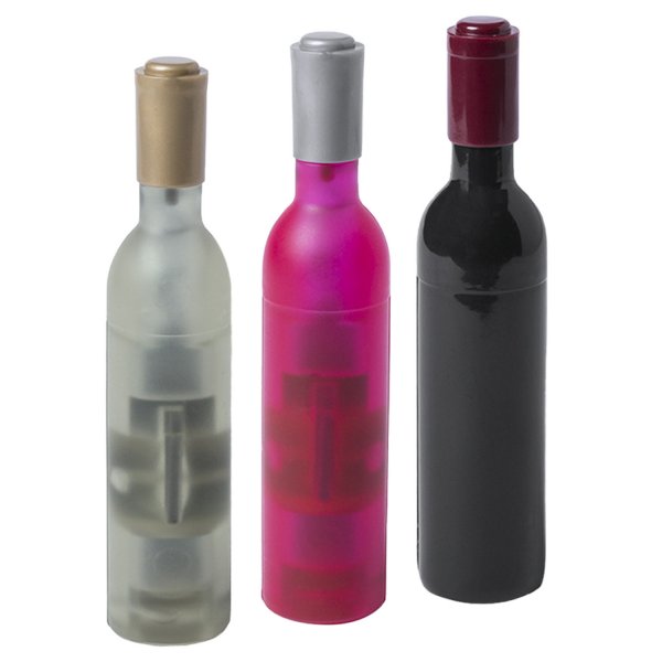 Fun magnetic corkscrew with the shape of a wine bottle in white, red and rose wine designs. With body in an original translucent finish and opening function. Colours: Black, Pink, Translucent. Dimensions: 11.5 x 2.5 cm.