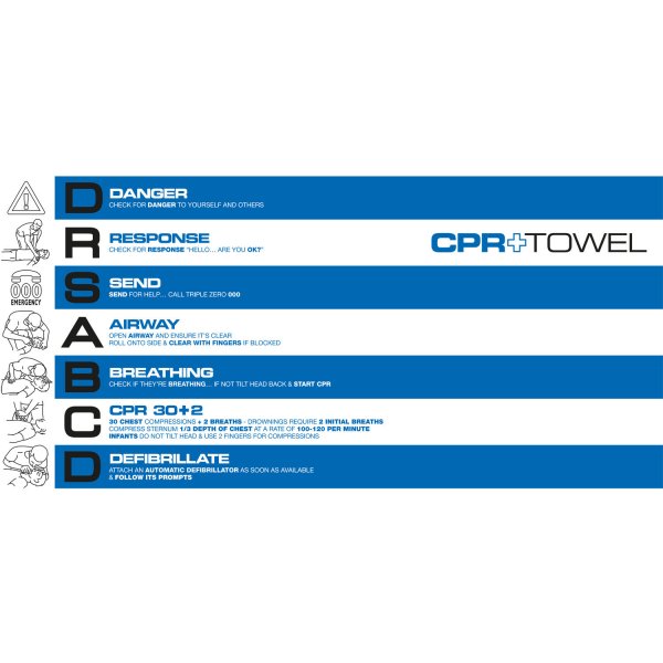 CPR Towel, a unique opportunity to align your brand with a safety message. Colours: Blue/White. Dimensions: 1500 x 750mm.