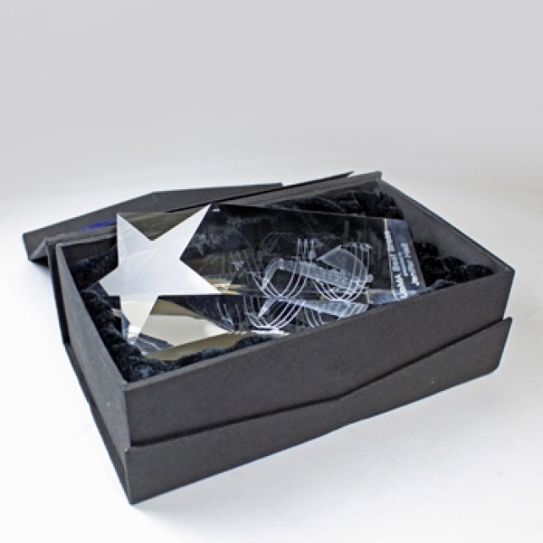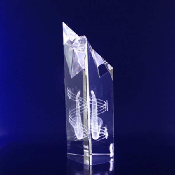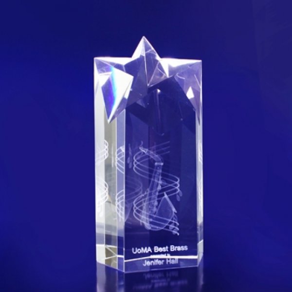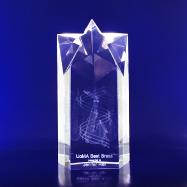 A five-sided crystal tower, the peak of which is polished into the shape of a star. A beautiful trophy crystal with enough depth for 3d designs. The Star Point come in three sizes for different levels of achievement. An elegant trophy design, our Star Pointed range of crystals have the depth for very detailed 3D artwork as well as height for a large amount of text.