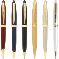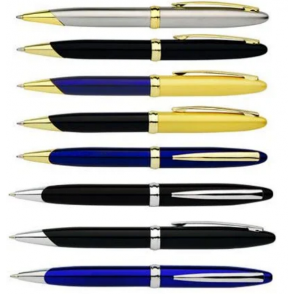 Elegantly styled classic twist action metal ball pen with shiny gold fittings and timeless French design. It has a brass barrel and a black large volume refill with 4000 metres of German manufactured Dokumental ink. Parker style refill. Colours: Black, Gold, Red, Royal, Silver, White. Dimensions: dia 11mm x L 140mm x 15mm (includes clip).