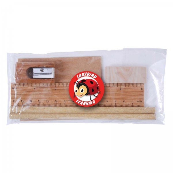 Bamboo stationery set packed in cello bag. Includes 20 sheet notepad, bamboo pencil sharpener, wooden timber pencils, eraser and bamboo ruler. Eco friendly bamboo is plantation grown, no chemicals or fertiliser used in growing. Colours: Natural. Dimensions: 200 x 91mm (LxH).