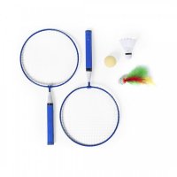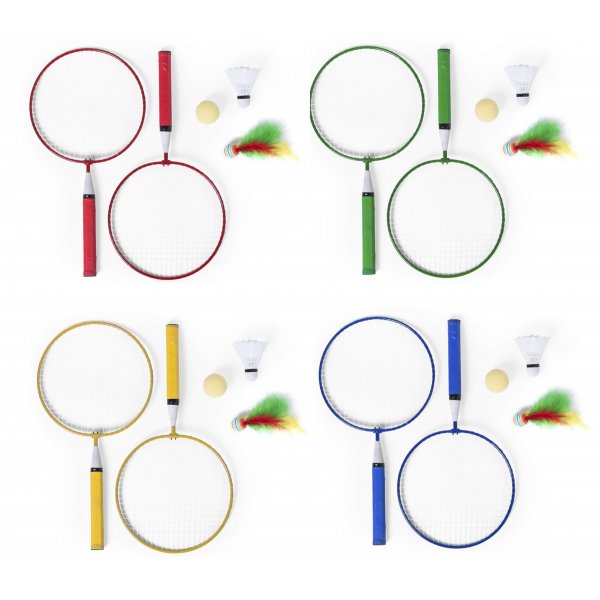 Pair of fun 3-in-1 rackets with soft and resistant handle. With two balls, one of them with multicolored feathers and a foam ball. Presented in a mesh bag. Colours: Blue, Green, Red, Yellow. Dimensions: 22.5 x 43.5 cm.