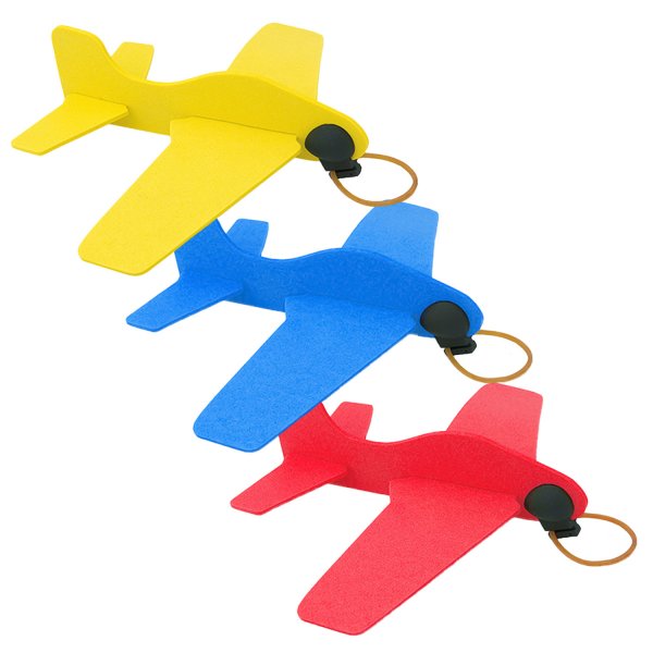 Detachable plane with soft body in EVA and elastic launcher. Presented in flat tablet for easy printing. Colours: Blue, Red, Yellow. Dimensions: 15 cm
