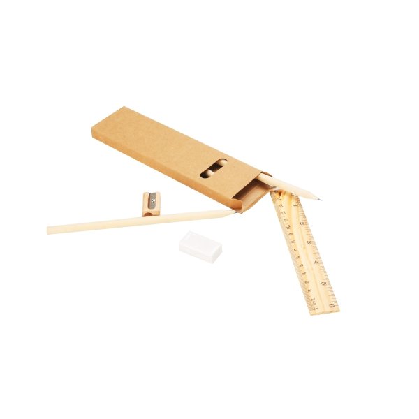 Custom Printed Pencils & Stationery Sets: 1 ruler +1 eraser +1 pencil sharpener + 3 pencils. The set is packaged in a recyclable kraft box. Colours: Natural. Dimensions: kraft box 178 x 48 x12 mm, pencil 178 x 8 (diameter) mm, shapener 27 x 16 x 11 mm.