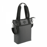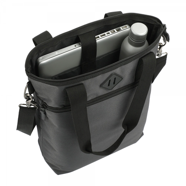 This tote features a padded laptop sleeve in the zippered main compartment. A zippered front pocket gives you extra storage. Carry this tote using the double drop handles or the adjustable, removeable shoulder strap. Main compartment capacity is approximately 18 litres. Saving the ocean one bag at a time! This computer tote is made externally from Repreve® recycled material. Repreve® is a recycled fiber made from plastic bottles that would otherwise be headed to landfill. Categorization: Charcoal. Dimensions: 381mm(w) x 406mm(h) x 120mm(d).