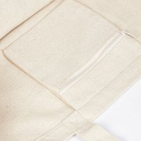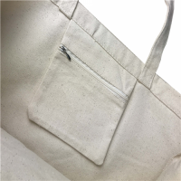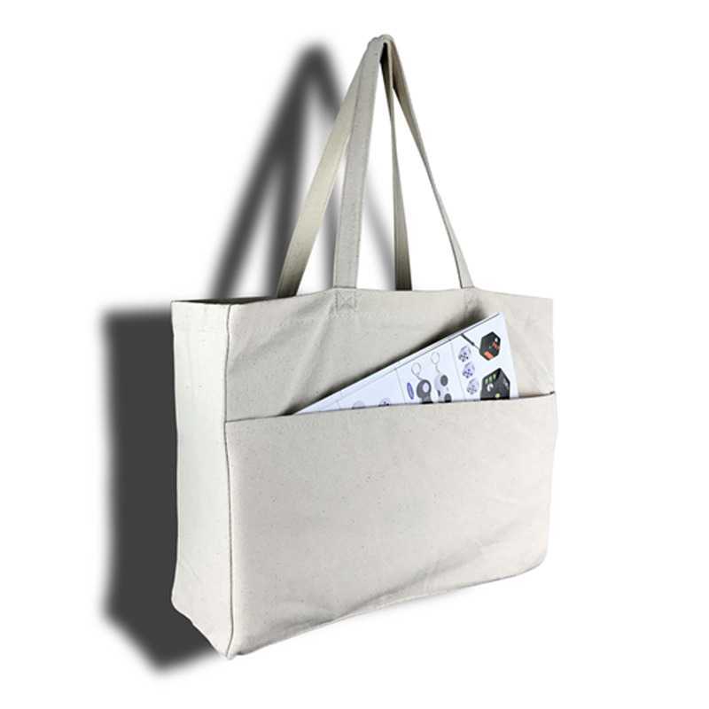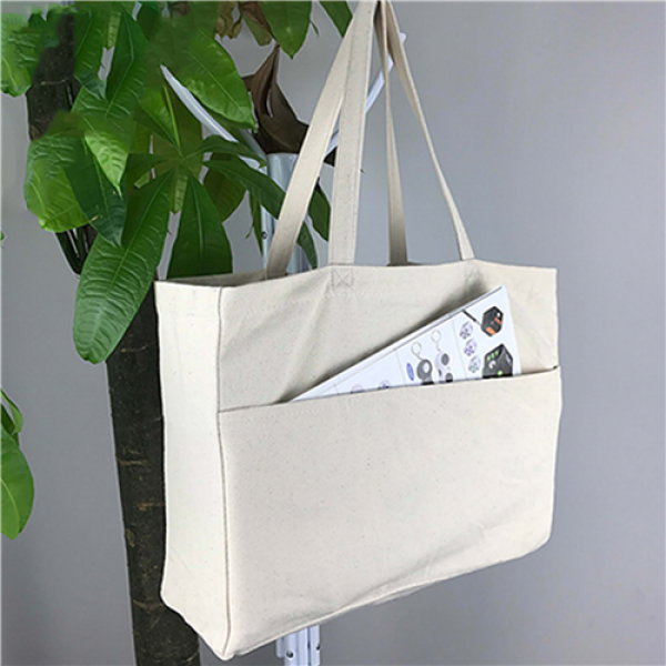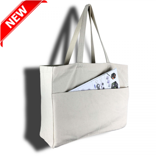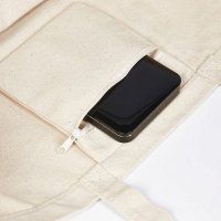 A trendy 12oz 100% cotton canvas shopper with short shoulder handles features a small zipped pouch inside and a large flip pocket in front.
