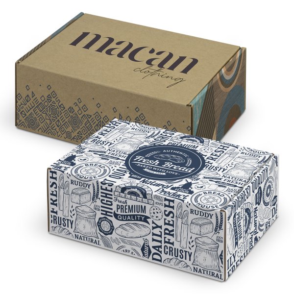 Professional custom presentation box made from durable 1.5mm e-flute corrugated cardboard to provide reliable protection during transit. This box is perfect for gifting and building strong brand recognition. Featuring a convenient hinged lid, all panels of the box can be customised with CMYK digital print. It is supplied flat-packed for easy postage and storage, and its self-locking design ensures hassle-free assembly. The assembled internal dimensions are 225mm x 167mm x 83mm (LxWxH). Colours: Natural, White/Natural. Dimensions: Assembled Internal: L 225mm x W 167mm x 83mm.