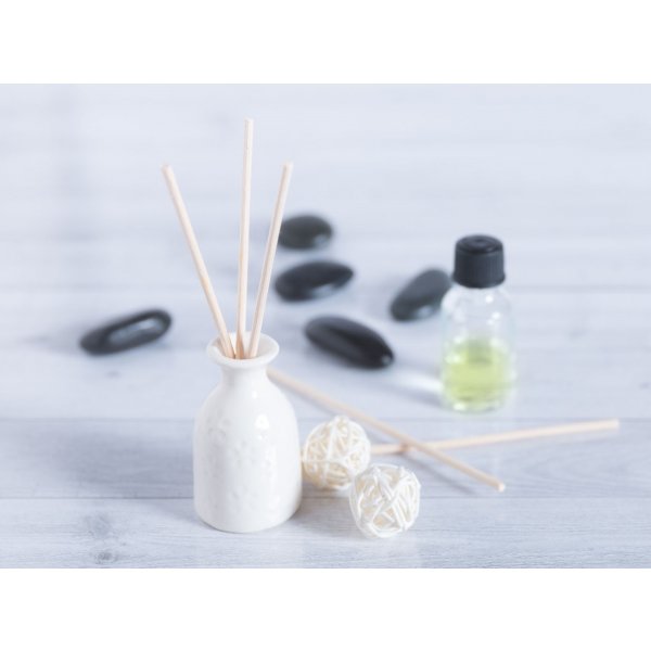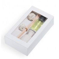 Aromatic diffuser with a pleasant jasmine aroma. Includes ceramic fragrance jar, aromatic sticks and 15ml glass jar with fragrance. Presented in an individual gift box with separate compartments and window. Colours: White/Natural. Dimensions: 9 x 15.7 x 4.2 cm.