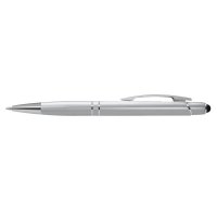 Retractable aluminium ball pen with shiny anodised coloured barrels and a matt anodised silver barrel, all of which have shiny chrome accents. It has a stylus for use with touch screens and a black refill with 800 metres of writing ink. The barrel laser engraves to an oxidised white colour and it can be presented in an optional black velvet sleeve or a gift box. Colours: Silver, Gunmetal, Dark Blue, Black. Dimension: Dia 10mm x L 135mm x 14mm (includes clip).