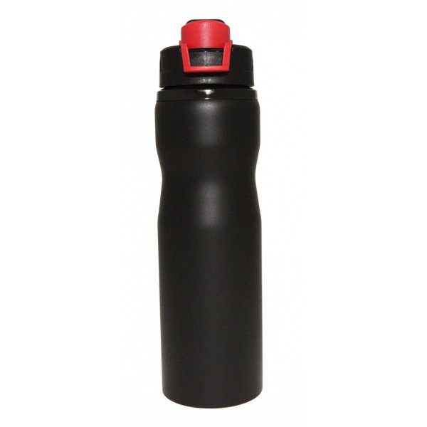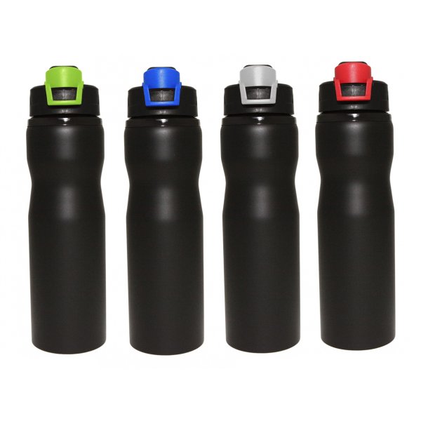 Stainless Steel Drink Bottle Black Matt body with coloured lid. BPA FREE, 750ml. Colours: Black/Red, Black/Green, Black/Blue, Black/Grey. Dimensions: 255 mm x 70 mm.