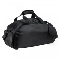 Duffel style bag in resistant nylon 420D. Zippered closure compartment for footwear and side pocket with zipper closure. Main compartment with double puller zipper and reinforced carrying handles, with velcro closure. Adjustable, padded shoulder straps and padded back. Colours: Black, Blue, Red. Dimensions: 47 x 25 x 24 cm.