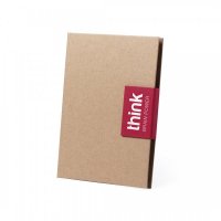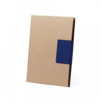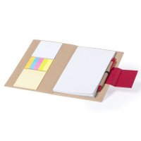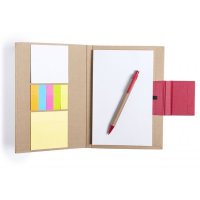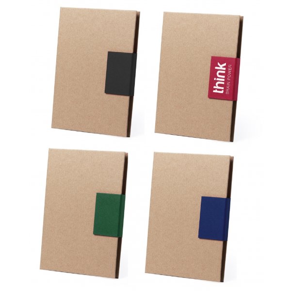 Sticky notepad with recycled cardboard ball pen included and original flap closure in bright tones. Soft-touch covers in resistant, rigid recycled cardboard. With 50 blank sheets, 30 large sticky notes, and 75 mini sticky notes. Colours: Blue, Black, Red, Green. Dimensions: 14.5 x 21 x 1.8 cm.