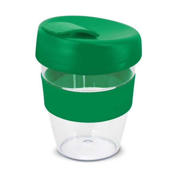 Crystal-clear 350ml reusable coffee cup with a heat-resistant silicone band and a secure screw on lid with a splashproof flip closure. The cup is manufactured from AS plastic and the lid is polypropylene. Both materials are BPA-free. The lid, flip closure and band can be mixed and matched in any colour combination from the standard colours at no extra cost. Up to five different colour combinations are included in the price and more are available for an additional charge. It can be presented in an optional black gift box on request. This product is not dishwasher safe and handwashing is recommended. Express Cup Claritas is protected under New Zealand Design Registration No. 419451 and Australian Design Registration No. 361937. Dimensions: Dia 90mm x H 100mm.