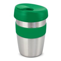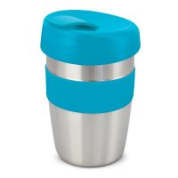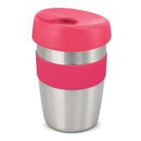 Design inspired 350ml double wall reusable coffee cup which will keep drinks hot for longer and remain cool to hold. It has a heat-resistant silicone band and a secure screw on lid with a splashproof flip closure. The cup has a stainless steel outer wall and the inner wall, lid and flip closure are manufactured from polypropylene. All the materials used are BPA-free. The cup, lid, flip closure and band can be mixed and matched in any colour combination from the standard colours. Up to five different colour combinations are included in the price and more are available for an additional charge. It is presented in a natural gift box. This product is not dishwasher safe and handwashing is recommended. Express Cup Elite is protected under New Zealand Design Registration No. 419451 and Australian Design Registration No. 361937. Dimensions: Cup: dia 80mm x H 150mm. Gift Box: H 142mm x W 92mm x 92mm